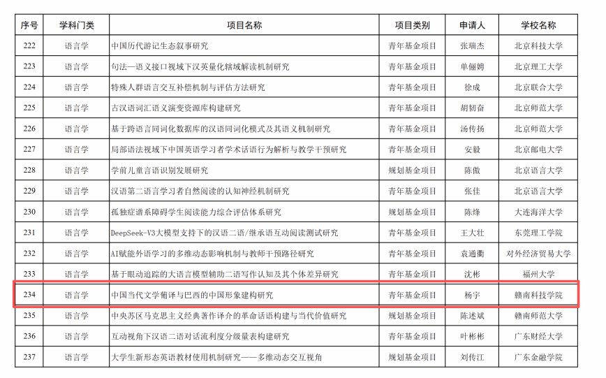 本网讯 :9月25日,教育部社会科学司正式公布2025年度教育部人文社会科学研究一般项目评审结果。我们文法学院葡萄牙语专业教师杨宇申报的《中国当代文学葡译与巴西的中国形象建构研究》成功获批青年基金项目。