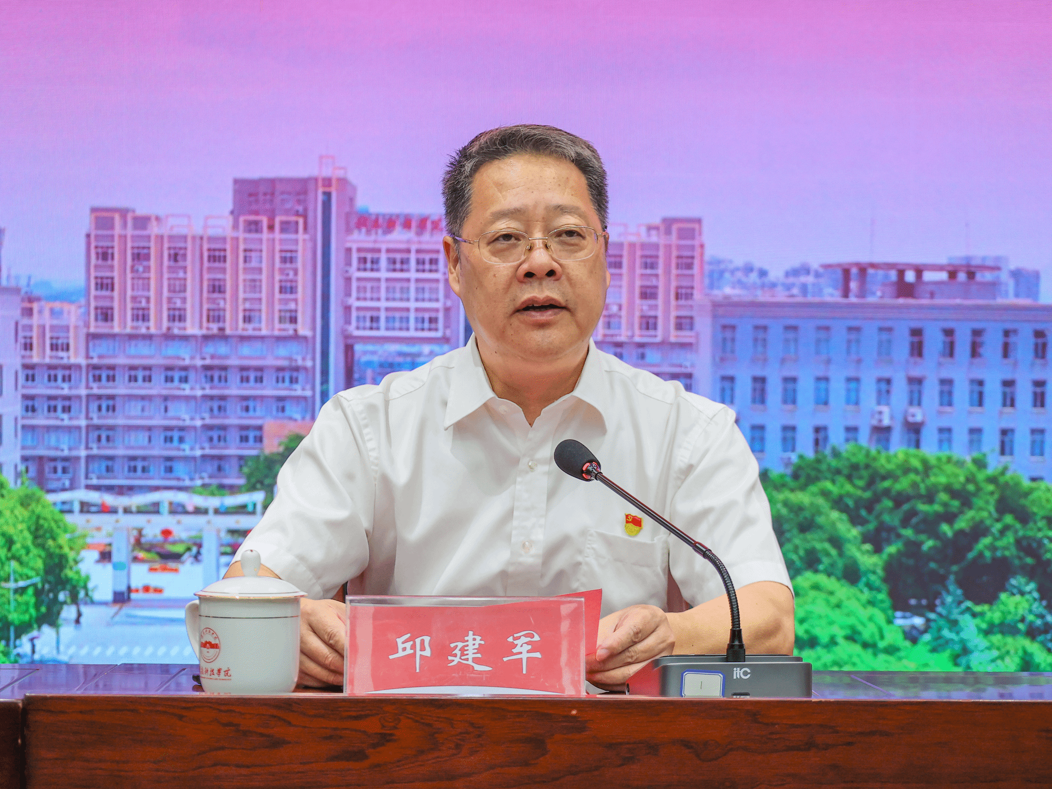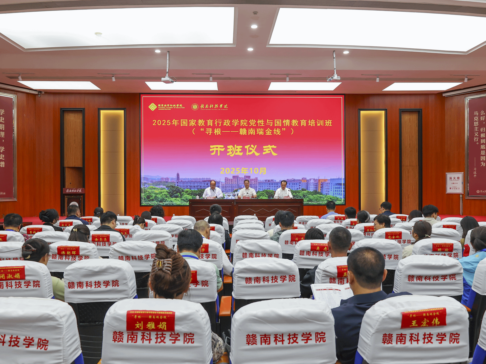 10月19日下午,培训开班仪式在我们逸豪学术报告厅举行。我们党委书记邱建军,国家教育行政学院党委副书记、纪委书记李雪明出席并讲话。我们党委委员、副校长左群主持开班仪式。邱建军代表学校对李雪明一行表示热烈欢迎,介绍了赣南作为“人民共和国摇篮”的红色历史底蕴,党在赣南地区艰苦卓绝而又光辉灿烂的革命历程,以及我们扎根红土地形成的“红色基因+产教融合”育人特色。他强调,学校精心设计了“理论学习+实地研学情景体验”的沉浸式课程体系,将全力保障培训实效,助力学员在学思践悟中汲取奋进动力,并预祝本次培训班取得圆满成功。