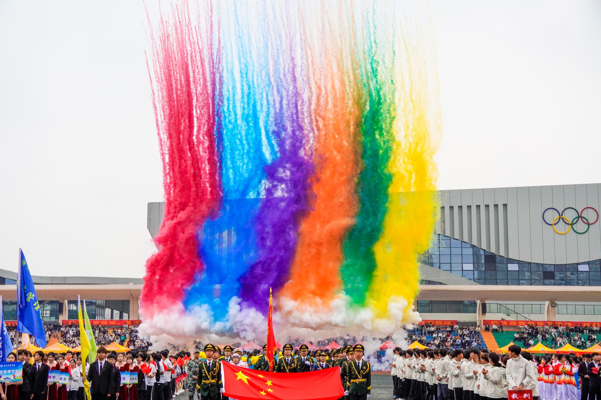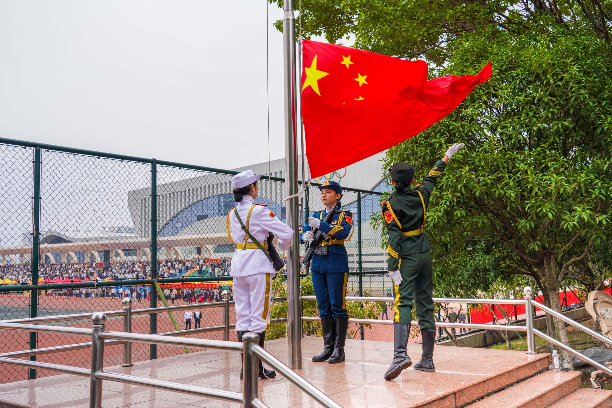 随着《运动员进行曲》奏响,国旗护卫队、管乐队、彩旗队、裁判员队、各学院方阵队及机关代表队迈着整齐划一的步伐入场。运动会入场仪式结束后,举行庄严的升旗仪式,全体师生肃立,面向冉冉升起的五星红旗行注目礼,奏唱国歌。