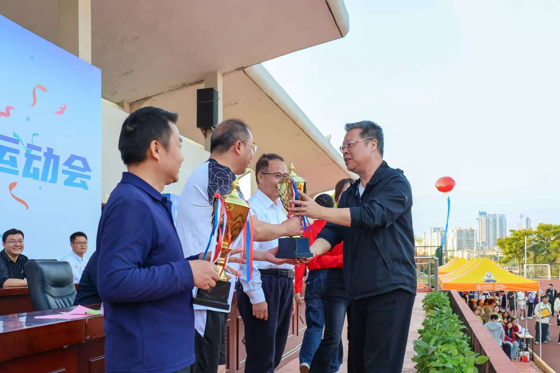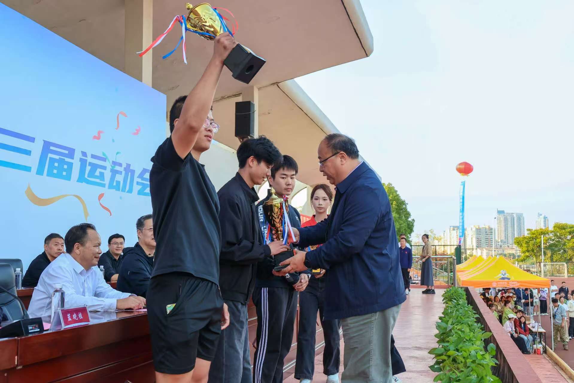 主席台就座的领导为获奖单位及优秀裁判员、运动员代表颁发荣誉证书和奖杯。
