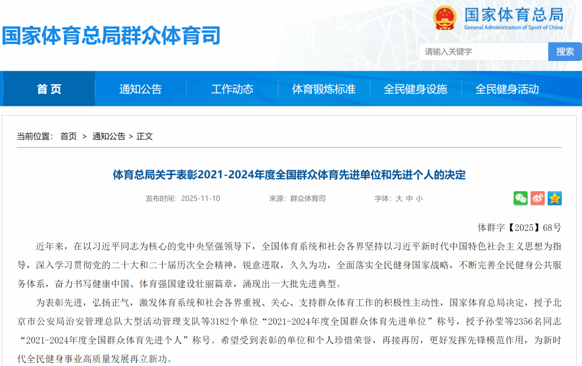 全国群众体育先进单位评选是经中央批准,由国家体育总局主导开展的群众体育领域综合性荣誉表彰活动,每四年举办一次。该评选自1993年起连续在全运会期间举行,是群众体育领域的最高荣誉之一。本次评选全国共有3182个单位获此殊荣,文法学院凭借扎实的工作基础、丰富的活动载体和显著的建设成效,经赣州市体育局初审推荐、省级审核及国家层面评审,从众多候选单位中脱颖而出,成为赣州市17个获推荐先进单位中成功获评的唯一高校代表。