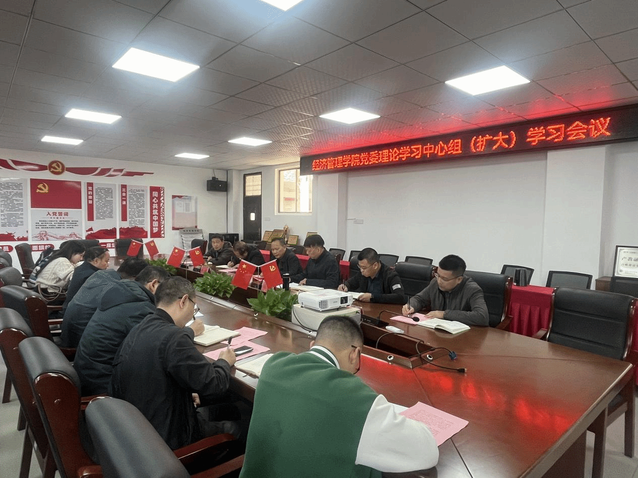 本网讯:11月25日下午,经济管理学院在新民楼305党员活动室召开党委理论学习中心组学习扩大会,深入学习贯彻党的二十届四中全会精神。学校党委委员、纪委书记陈文新到会指导。学院党委书记肖永鸿主持,学院党委委员、副院长钟滨,党委委员梁文学、葛志财、王波围绕学习主题与分管工作作交流发言。各党支部书记、教研室主任列席会议。