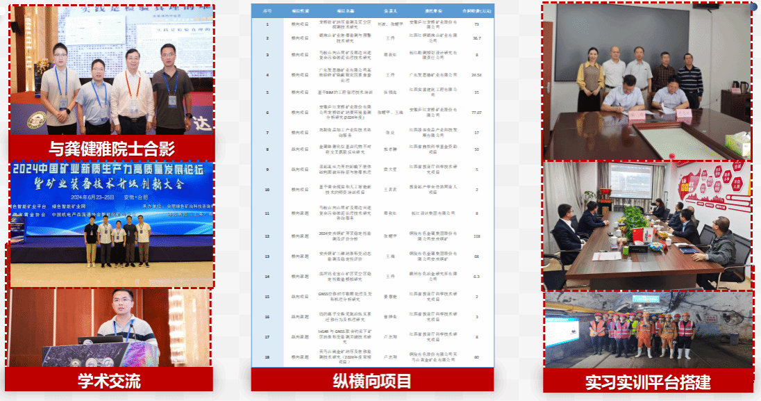 通过校企合作,引入地压监测及岩移控制技术、InSAR和GNSS技术监测、三维激光扫描空区建模和无人机测绘等新技术应用在铜陵有色集团安庆铜矿、天马山黄金矿、安徽龙桥铁矿、江西省龙南足洞稀土矿等合作课题。科研课题通过研究成果的转化,有效促进了高校科技创新与矿山特色行业结合,推动了技术进步和产业升级,横向课题合同经费超1650万元,到账经费近千万元,累计产生了直接经济效益1500余万元,间接经济效益8.5亿元。