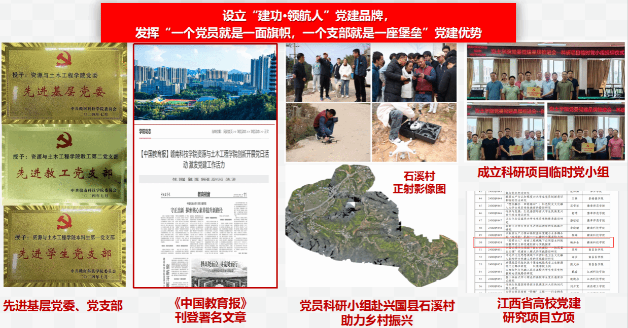 学院党委紧密围绕以“建功・领航人”党建品牌为总抓手,深入推进“一支部一特色”建设与临时党小组工作模式创新。在品牌建设方面,教工第一党支部创建“旗帜·领航” 品牌,获批首批“学校‘双带头人’教师党支部书记工作室”建设单位;教工第二党支部打造“红匠·领航”品牌,以“四心工程”为核心,被省委教育工委推荐至教育部参与“全国党建工作样板支部”评选;本科生第一党支部创办“红星・先锋”品牌,深耕“党建+学科竞赛”特色育人路径;本科生第二党支部打造“红星·知行”品牌,以传承红色精神为主线,实施“1+4”工程。学院创新设立的科研临时党小组,充分发挥专业特色,通过党建引领推动学术研究与创新。学院党建相关活动被“中国教育报”“江西日报”“赣南日报”“大江网”“中国网”等媒体广泛报道。
