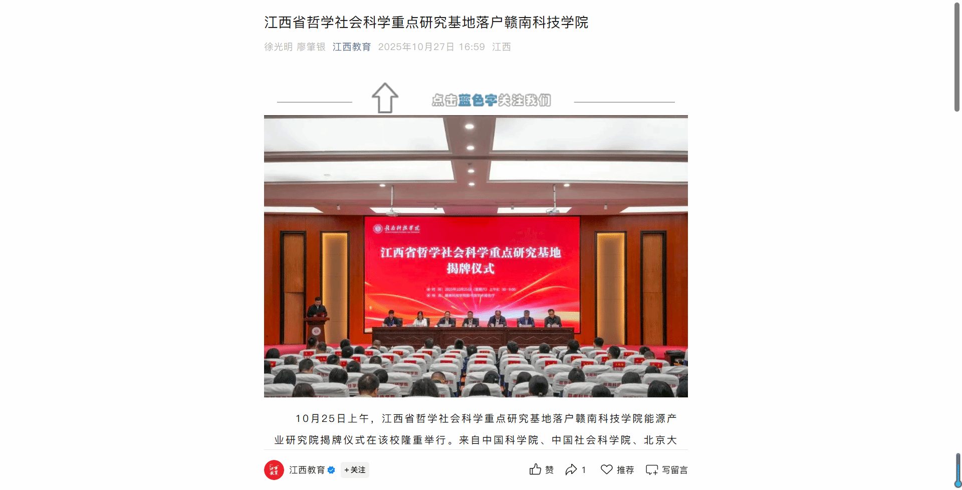248cc永利集团能源产业研究院组建于2024年,同年获批江西省民营经济研究点、赣州市哲学社会科学研究基地,2025年8月获批江西省哲学社会科学重点研究基地。江西省哲学社会科学重点研究基地落户揭牌仪式的隆重举行,标志着248cc永利集团能源产业学院“产学研用一体化”应用型人才培养体系的构建迈上新台阶。