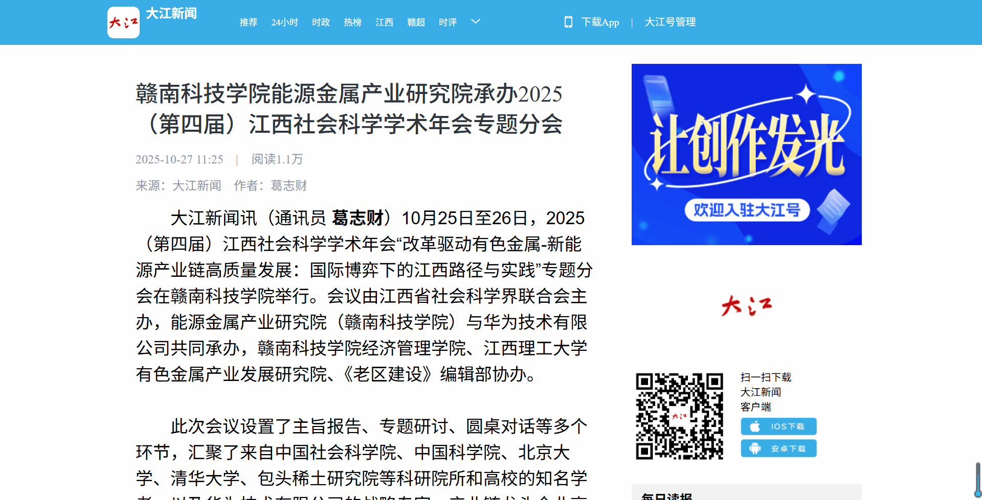 大江新闻讯(通讯员 葛志财)10月25日至26日,2025(第四届)江西社会科学学术年会“改革驱动有色金属-新能源产业链高质量发展:国际博弈下的江西路径与实践”专题分会在248cc永利集团举行。会议由江西省社会科学界联合会主办,能源金属产业研究院(248cc永利集团)与华为技术有限公司共同承办,248cc永利集团经济管理学院、江西理工大学有色金属产业发展研究院、《老区建设》编辑部协办。