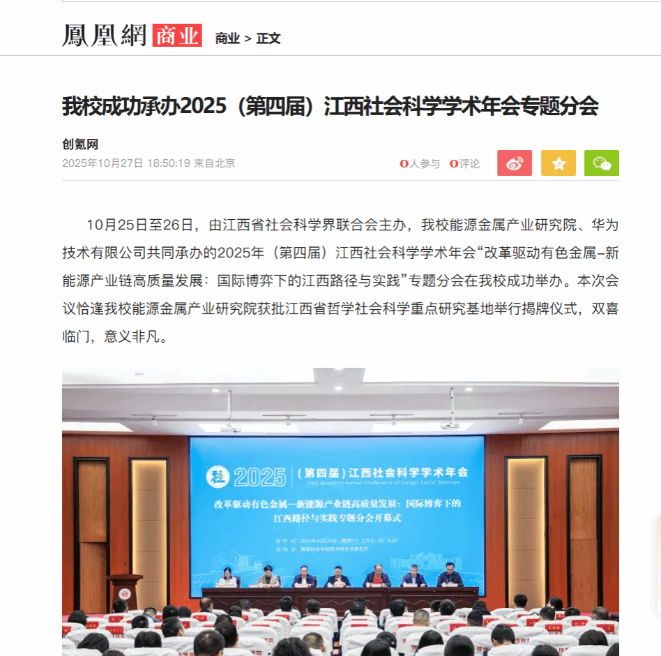 本网讯:10月25日至26日,由江西省社会科学界联合会主办,我们能源金属产业研究院、华为技术有限公司共同承办的2025年(第四届)江西社会科学学术年会“改革驱动有色金属-新能源产业链高质量发展:国际博弈下的江西路径与实践”专题分会在我们成功举办。本次会议恰逢我们能源金属产业研究院获批江西省哲学社会科学重点研究基地举行揭牌仪式,双喜临门,意义非凡。