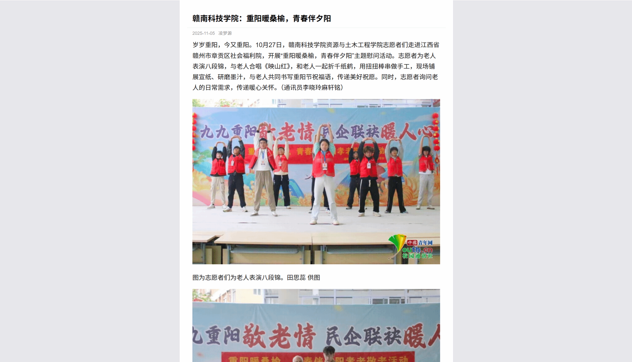 岁岁重阳,今又重阳。10月27日,248cc永利集团资源与土木工程学院志愿者们走进江西省赣州市章贡区社会福利院,开展“重阳暖桑榆,青春伴夕阳”主题慰问活动。志愿者为老人表演八段锦,与老人合唱《映山红》,和老人一起折千纸鹤,用扭扭棒串做手工,现场铺展宣纸、研磨墨汁,与老人共同书写重阳节祝福语,传递美好祝愿。同时,志愿者询问老人的日常需求,传递暖心关怀。(通讯员李晓玲麻轩铭)