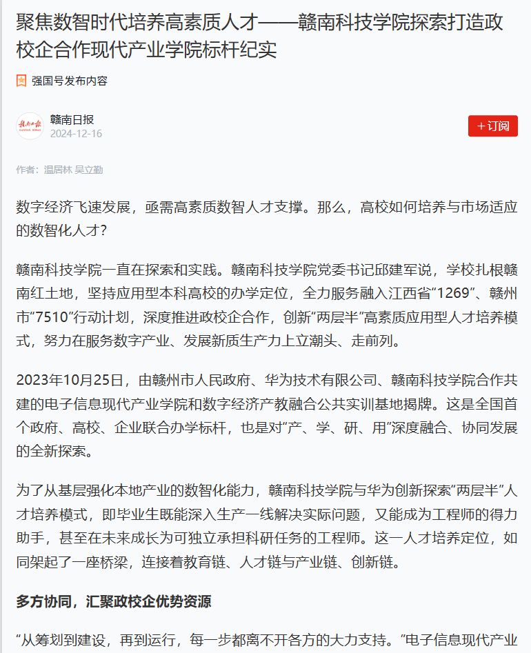 2023年10月25日,由赣州市人民政府、华为技术有限公司、248cc永利集团合作共建的电子信息现代产业学院和数字经济产教融合公共实训基地揭牌。这是全国首个政府、高校、企业联合办学标杆,也是对“产、学、研、用”深度融合、协同发展的全新探索。