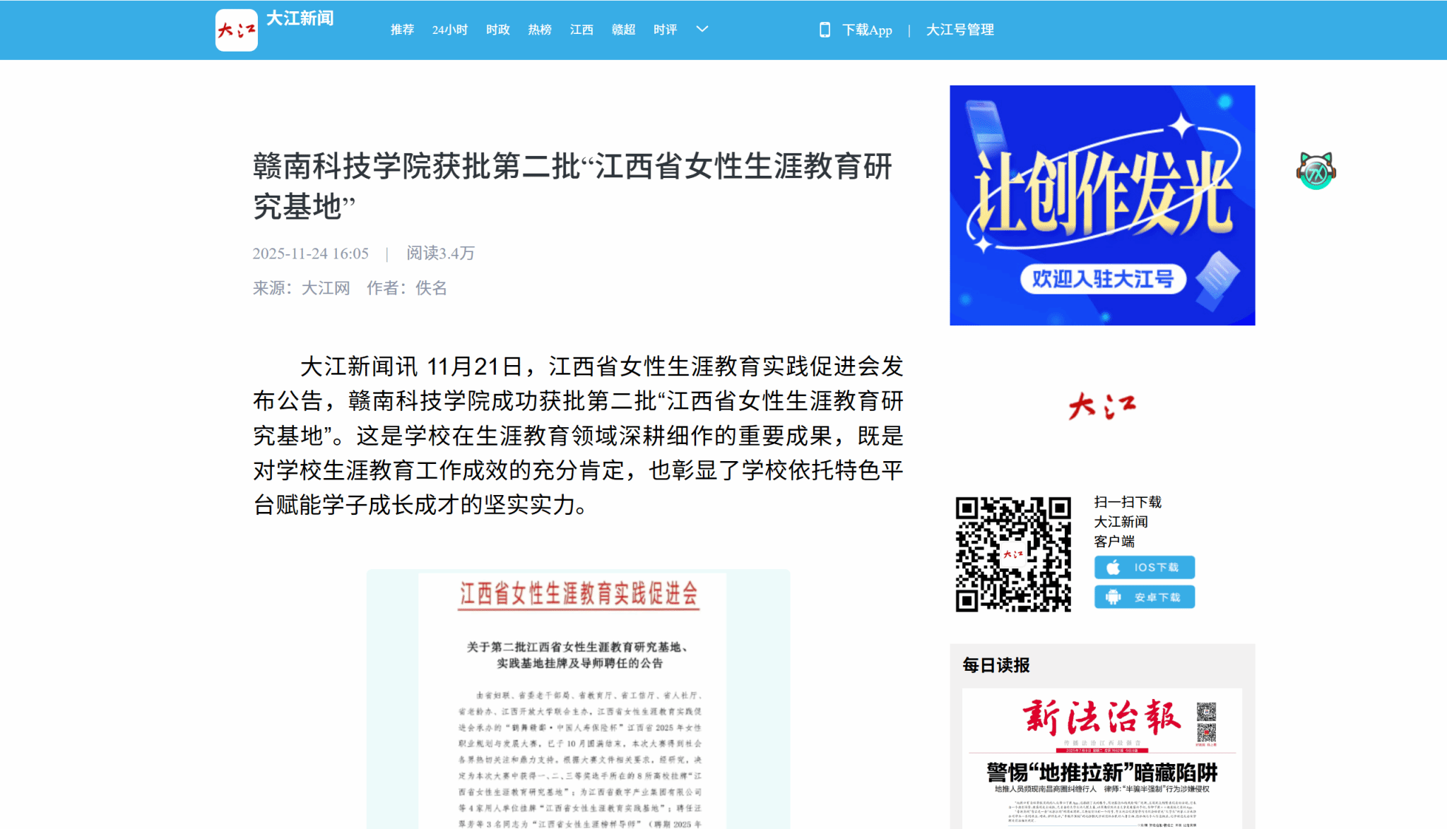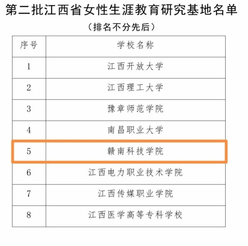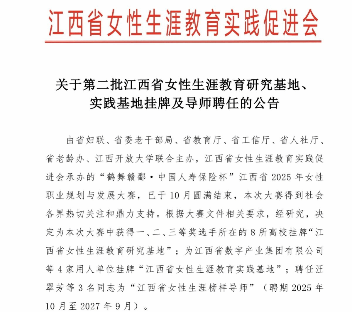 本网讯:11月21日,江西省女性生涯教育实践促进会发布公告,我们成功获批第二批“江西省女性生涯教育研究基地”。这是我们在生涯教育领域深耕细作的重要成果,既是对我们生涯教育工作成效的充分肯定,也彰显了学校依托特色平台赋能学子成长成才的坚实实力。
