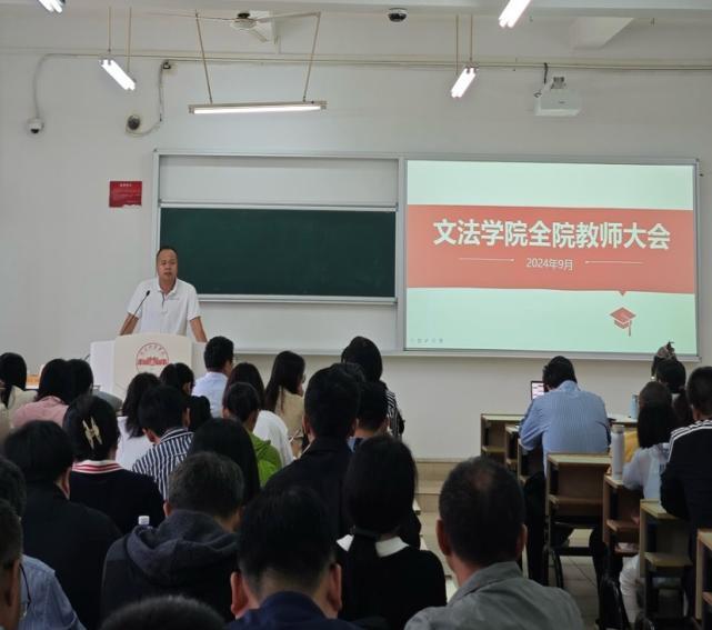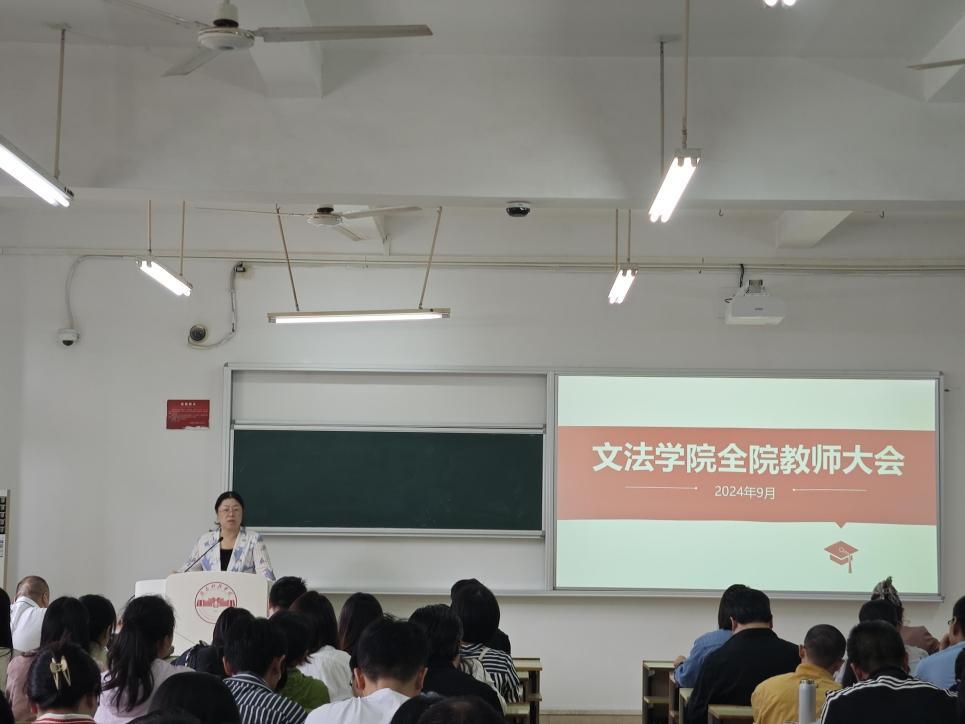 本网讯:9月24日下午,文法学院召开了全院教职工大会,进一步营造迎接本科教学工作合格评估的浓厚氛围,扎实推动迎评促建工作取得实效。文法学院副院长高健婕,学生工作负责人王军堂、教学工作负责人何建军及文法学院全体教师参加了此次会议。