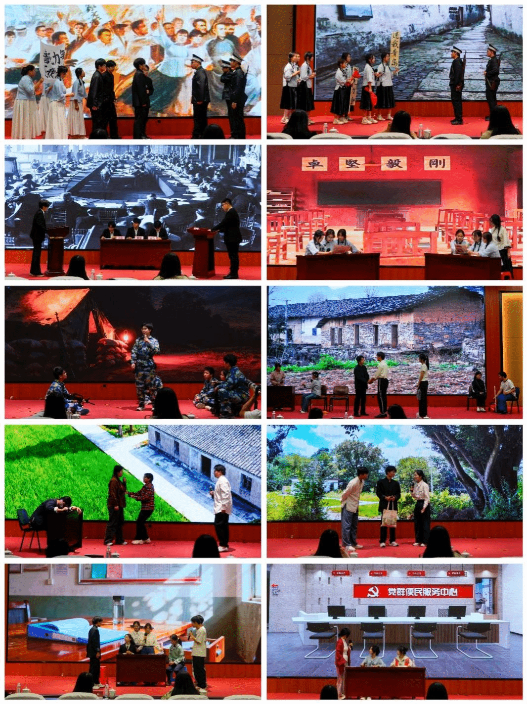 比赛现场气氛热烈、亮点纷呈,参赛选手们突破传统说教模式,以饱满的情感和精湛的表演,将理论叙事与情景演绎深度融合,灵活运用说、诵、唱、演等多元创意形式,为现场师生呈现了一场精彩纷呈的家国情怀盛宴。话剧《山花开》生动再现了张桂梅同志扎根山区、矢志办学的奉献历程,通过点亮教育之光破解山区孩子求学困境,以实际行动阻断贫困代际传递,深刻诠释了共产党员坚守初心使命、践行责任担当的崇高风范;话剧《81192》以王伟同志的视角为切入点,全景展现我国航天事业从“以生命追赶差距”到“用辉煌告慰英灵”的跨越式发展,彰显了一代代航天人报国为民、攻坚克难的赤诚担当;话剧《太阳出来喜洋洋》围绕乡村光伏电站建设这一核心线索,生动讲述新思想破除封建迷信桎梏、引领社会主义新农村建设的生动实践,勾勒出新时代乡村振兴的奋进图景。此外,其余参演话剧亦紧扣时代主题、聚焦奋斗征程,或追忆革命先辈的峥嵘岁月,或展现新时代建设者的实干担当,或描绘基层一线的为民情怀,题材丰富、内涵深刻。
