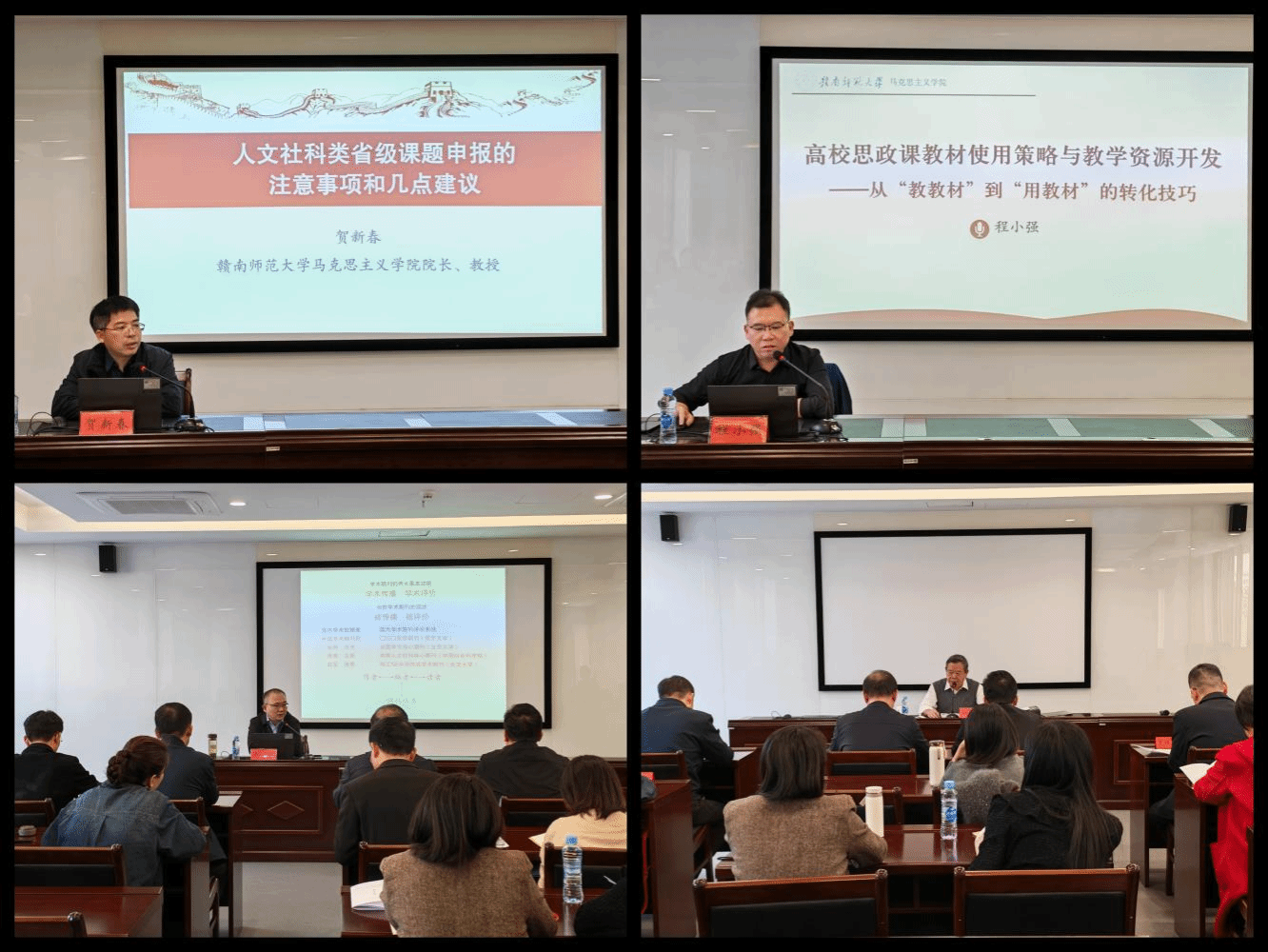 开班仪式后,江西社会科学杂志社、赣南师范大学以及瑞金干部学院的专家学者,围绕教学、科研以及党的建设等方面作专题辅导。江西社会科学杂志社副社长俞晖以《论文写作、学术规范与投稿技巧》为题,从论文选题、框架搭建到论证逻辑优化等维度展开讲解,为教师们搭建起学术研究与成果转化的实操桥梁。赣南师范大学马克思主义学院院长、教授贺新春以《人文社科类省级课题申报的注意事项和几点建议》为题,结合各类省级课题申报实际,从课题类型解析、选题方向把握、论证体系构建等维度,为教师们科研攻关提供精准指导,助力破解课题申报难点。赣南师范大学马克思主义学院副教授程小强以《高校思政课教材体系向教学体系转化的实施策略与资源开发》为题,解析从“教教材”到“用教材”的转化技巧与创新路径,为思政课堂提质增效提供实践方案。江西瑞金干部学院客座教授邱礼斌围绕《党的政治纪律和政治规矩》授课,明确马克思主义学院“在马言马”的工作定位和职责,进一步强化思政课教师的政治素养与责任担当。