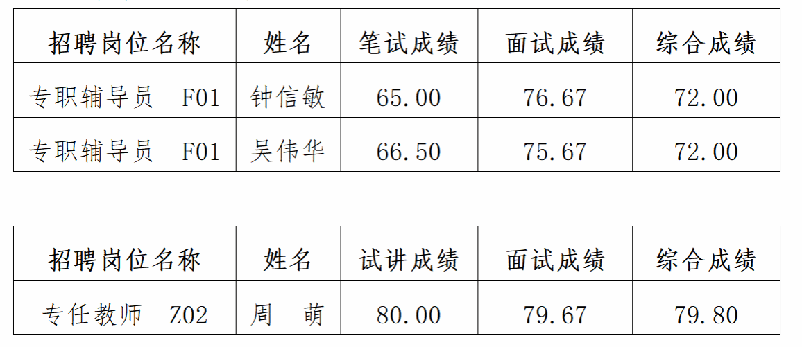 专职辅导员F01岗入闱对象曹勇、刘德翔,专任教师Z02岗入闱对象姚志鹏等3人因个人原因放弃入闱资格。根据《248cc永利集团2023年专职辅导员及硕士师资公开招聘公告》中“因体检、心理测试、考察不合格或考生自动放弃产生的空额,根据总成绩从高分到低分递补一次。”的工作要求,拟递补F01岗考生钟信敏、吴伟华,Z02岗考生周萌进入本岗位考察体检程序。