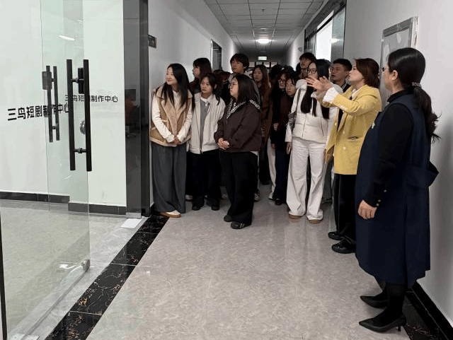 当日上午,师生一行抵达叁鸟(赣州)科技有限公司后,在企业对接人的带领下对工作岗位与工作环境开展考察。企业团队首先围绕短剧行业发展现状、核心业务板块及人才需求方向进行介绍,重点展示了短剧制作中的视觉设计、数字后期、场景搭建等关键环节。考察过程中,视觉传达设计专业学生认真观察短剧海报设计、角色形象视觉包装的工作流程,与企业设计师交流品牌视觉符号在短剧中的运用技巧;数字媒体艺术专业学生聚焦后期剪辑、特效制作、短视频运营等岗位,详细询问软件操作要求与项目周期管理细节;环境设计专业学生则针对短剧实景拍摄场地的空间规划、场景氛围营造与功能性设计展开调研,深入了解行业对空间设计的实战需求。实地考察让学生们跳出课堂理论框架,直观感受到设计学科在影视行业的应用场景,为个人职业规划提供了清晰参考。