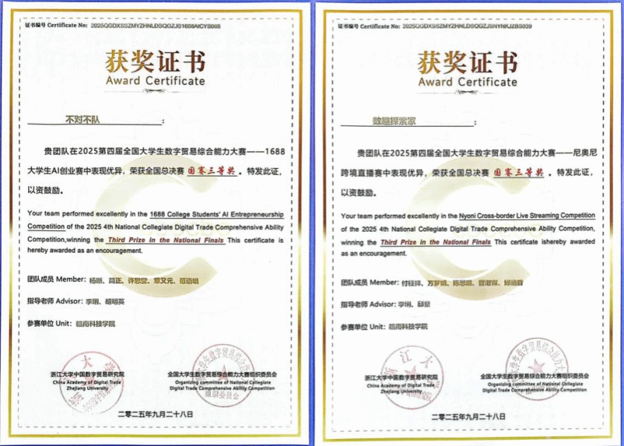 本网讯:9月26日—28日,2025年第四届全国大学生数字贸易综合能力大赛全国总决赛顺利举行。我们李琍、胡明英两位老师联合指导的学生队伍,凭借出色的表现在1688大学生AI创业赛道荣获国家三等奖,该团队成员由会计233班杨晰、会计233班简正、国贸242班许思莹、通信231班章又元、工商231班范语培等五位同学组成。另有邱景、李琍两位老师指导的学生团队在尼奥尼跨境直播赛道喜获国家三等奖,团队成员包括由英语232班付桂祥、方梦娟和数字经济242班陈思晴、曾泔甯、邱涵哲等五位同学。