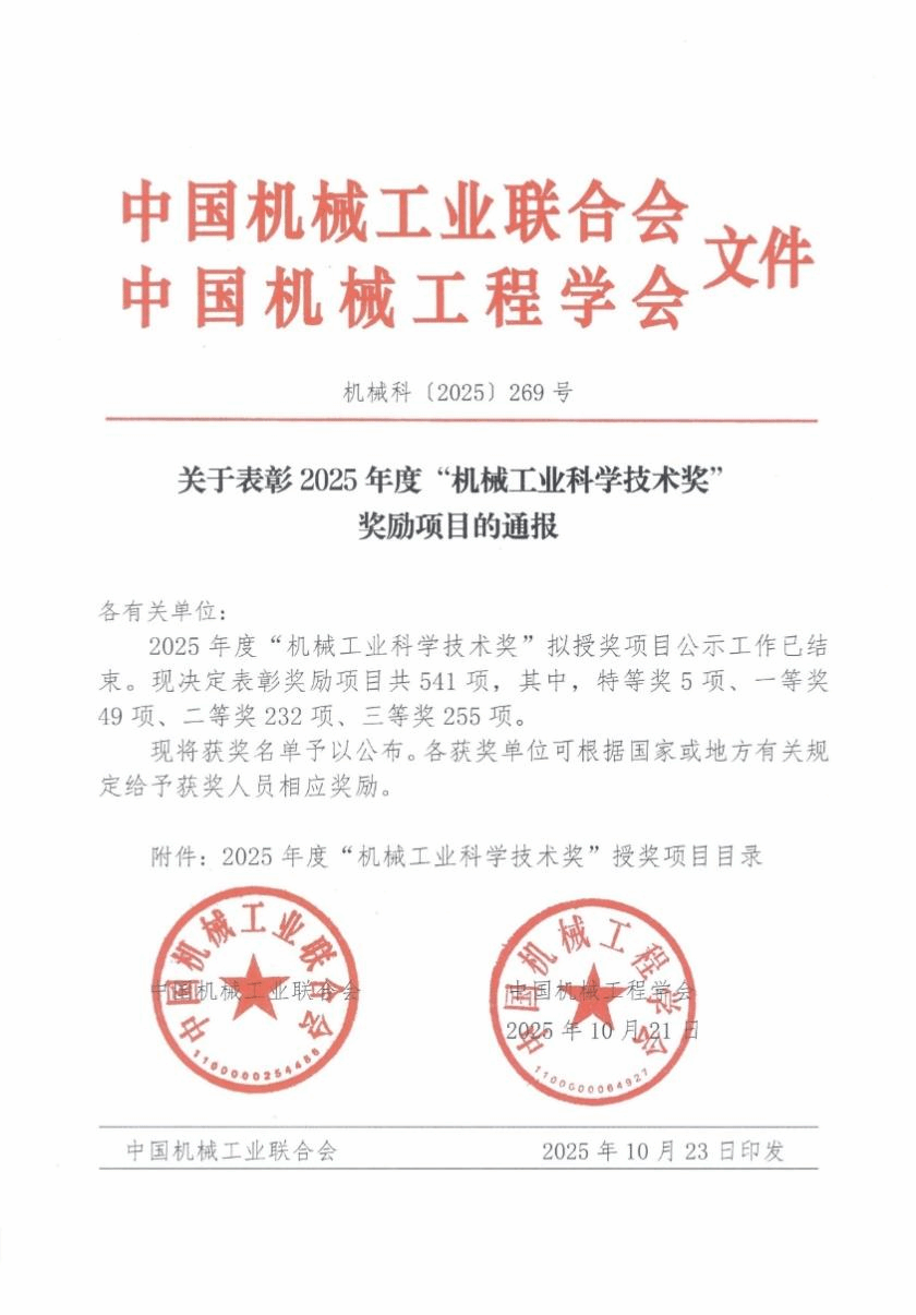 据悉,机械工业科学技术奖是经国家科学技术部批准,由中国机械工业联合会与中国机械工程学会共同设立的全国性行业科技奖项,旨在表彰在机械工业科学研究、技术创新与开发、成果推广应用等方面做出突出贡献的单位与个人,是衡量机械工业科技水平的重要标尺之一。