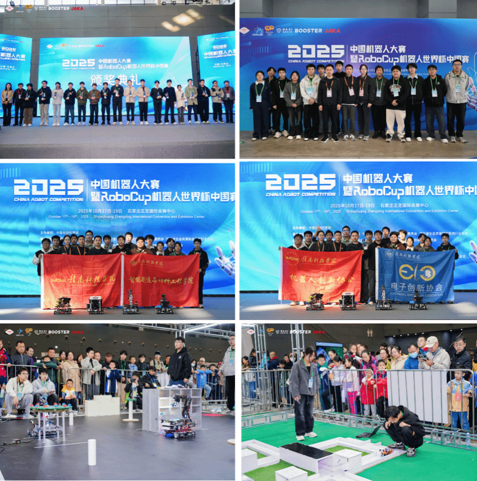 本网讯:近日,2025年中国机器人大赛暨RoboCup机器人世界杯中国赛在河北石家庄举行。比赛吸引了清华大学、上海交通大学、西安交通大学、浙江大学、哈尔滨工业大学等国内300多所高校的1600多支队伍、5000名师生报名参赛。经过激烈的角逐,我们智能智造与材料工程学院师生团队表现突出,斩获国赛一等奖3项,二等奖3项,三等奖4项,其中“智造先锋1队”勇夺全国亚军,创下我们在该项国家级赛事中的历史最佳成绩!